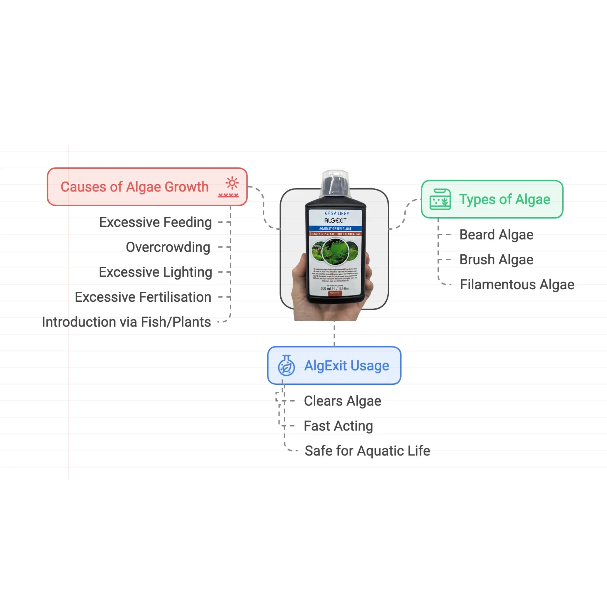 AlgExit is a safe and effective product for combating almost all types of algae in a freshwater aquarium. Algae, such as beard algae, brush algae and filamentous algae, are effectively wiped out. AlgExit is easy and economical to use and harmless to fish, shrimps, molluscs and plants. The algae growth is first brought to a standstill and then it disappears. Any algae spores that are still present in the water are removed.